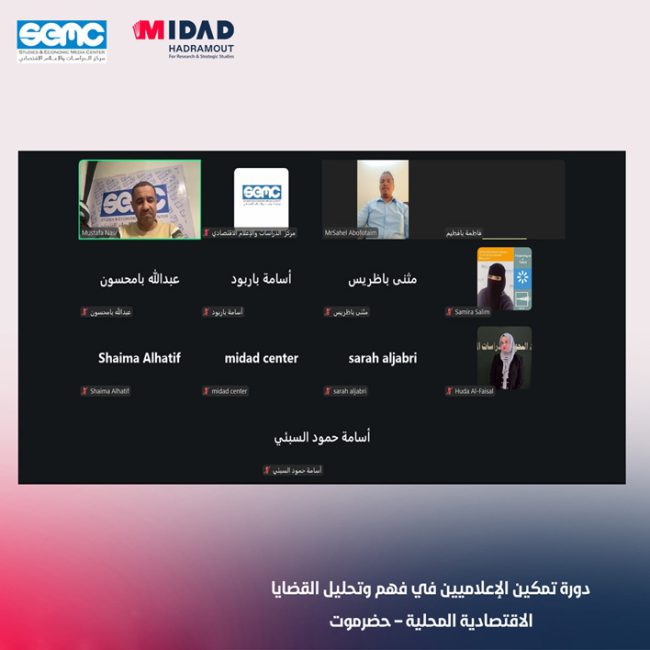 دشن مركز الدراسات والإعلام الاقتصادي ومركز مداد حضرموت للأبحاث والدراسات الاستراتيجية، اليوم الأربعاء، 14 يناير 2026، ورشة تدريبية متخصصة حول تمكين الإعلاميين في فهم وتحليل القضايا الاقتصادية المحلية، تُعقد افتراضيا عبر منصة زوم على مدى يومين، بمشاركة عدد من الصحفيين والإعلاميين المهتمين بالشأن الاقتصادي، في محافظة حضرموت، شرقي اليمن.