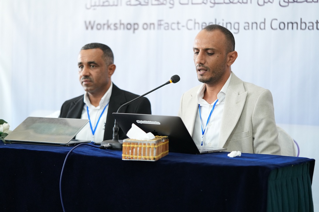 The two-day workshop, held in person in Taiz and simultaneously online, includes discussion and analytical sessions on Yemen’s media landscape, the challenges of disinformation, and mechanisms for building professional cooperation between media outlets and fact-checking platforms, all leading toward drafting the outlines of a national roadmap to strengthen verification processes and combat disinformation.